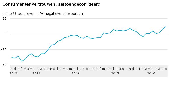 De stemming onder consumenten is in oktober opnieuw verbeterd, meldt CBS. Het consumentenvertrouwen steeg 4 punten en komt uit op 12. De indicator voor het vertrouwen bereikt hiermee de hoogste waarde na augustus 2007. Vooral de koopbereidheid neemt sterk toe. Verder oordelen consumenten iets positiever over het economisch klimaat.