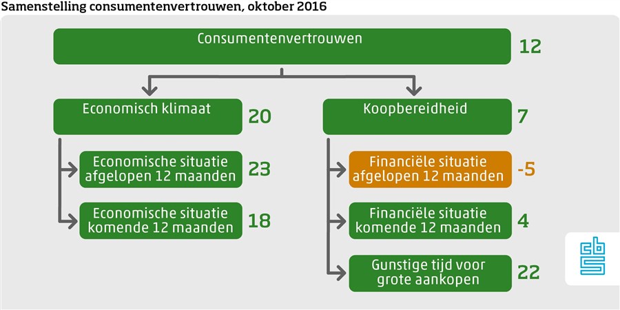 Met 12 ligt het consumentenvertrouwen in oktober ruim boven het gemiddelde over de afgelopen twintig jaar (-8). Het vertrouwen bereikte in april 2000 de hoogste stand ooit (27). Het dieptepunt werd bereikt in februari 2013 (-44).