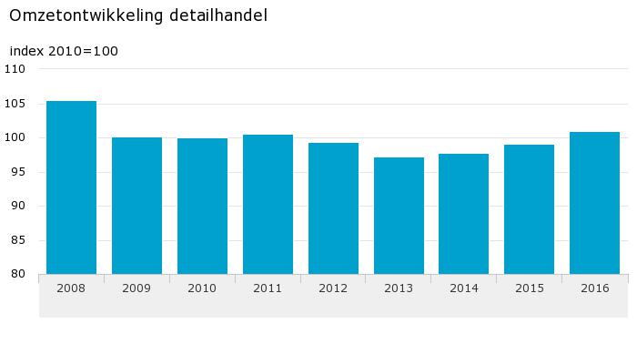De omzet van de detailhandel is in 2016 echter nog 4,3 procent lager dan in 2008. Voor de non-foodwinkels is het omzetverlies sinds de crisis nog bijna 16 procent. De omzet van winkels in voedings- en genotmiddelen is echter bijna 12 procent hoger dan voor de crisis.