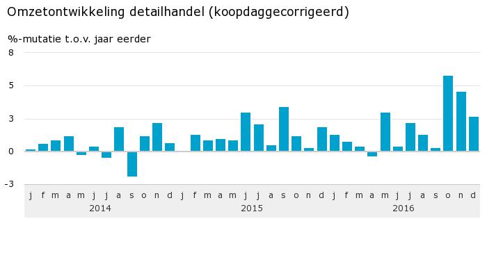 In december heeft de detailhandel 2,7 procent meer omgezet dan een jaar eerder, meldt het CBS. De verkopen (volume) waren 1,1 procent hoger. Zowel de foodsector als de non-foodsector realiseerde een hogere omzet. Daarnaast is online ruim 12 procent meer omgezet. Over heel 2016 was de omzetgroei van de detailhandel 1,9 procent. Dat is de hoogste omzetgroei in 8 jaar.
