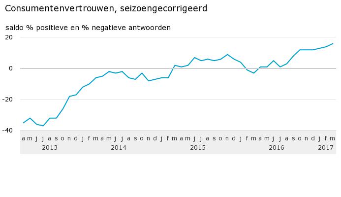 Met 16 ligt het consumentenvertrouwen in maart ruim boven het gemiddelde over de afgelopen twintig jaar (-8). Het vertrouwen bereikte in april 2000 de hoogste stand ooit (27). Het dieptepunt werd bereikt in februari 2013 (-44).