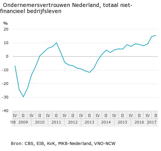 Het ondernemersvertrouwen bereikt daarmee het hoogste niveau sinds het begin van de metingen eind 2008. Ook de verwachtingen voor de werkgelegenheid zijn positief. Dat melden het CBS, de Kamer van Koophandel, EIB, MKB-Nederland en VNO-NCW.