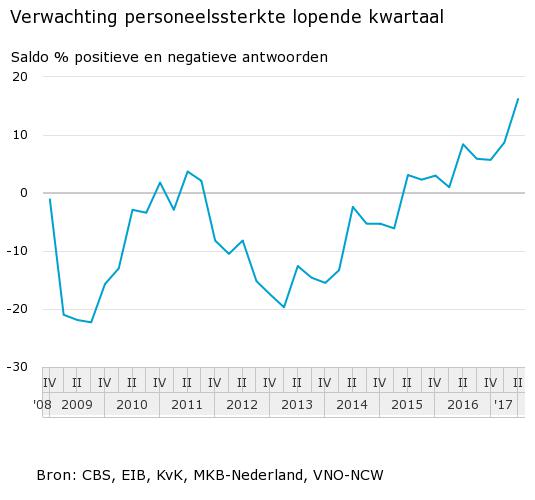 Het aantal ondernemers dat uitbreiding van de werkgelegenheid verwacht, is verder toegenomen. Per saldo verwacht ruim 16 procent van de ondernemers een toename van de personeelssterkte in het tweede kwartaal. Dit aantal is sinds het begin van de metingen in 2008 niet eerder zo groot geweest als nu. Vorig jaar in het tweede kwartaal verwachtte ruim 8 procent van de ondernemers een uitbreiding van de werkgelegenheid.